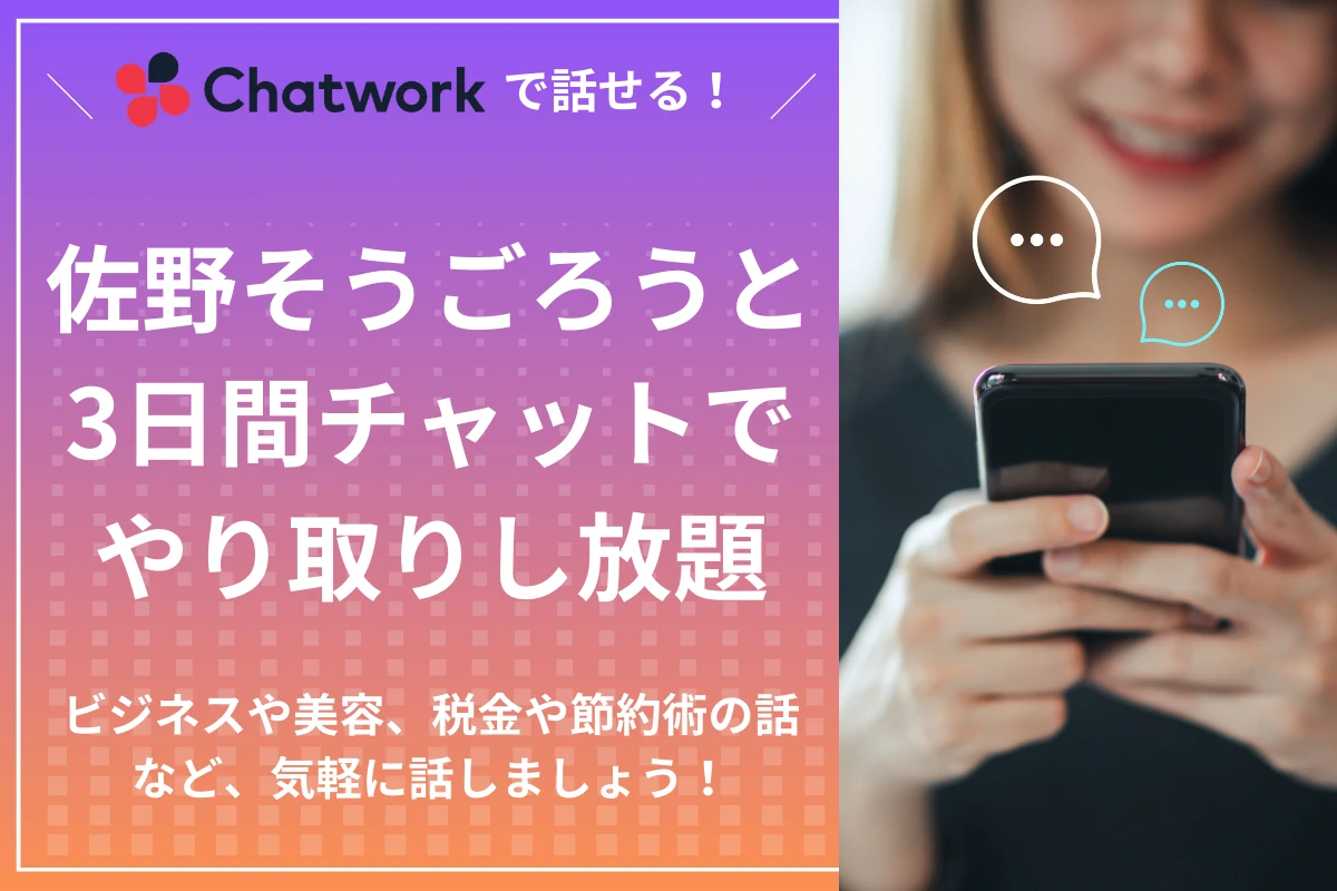 - チャットワークを使って、佐野そうごろうと3日間やり取りし放題のコースです。ビジネスや美容、税金や節約術の話など、気軽に話しましょう!